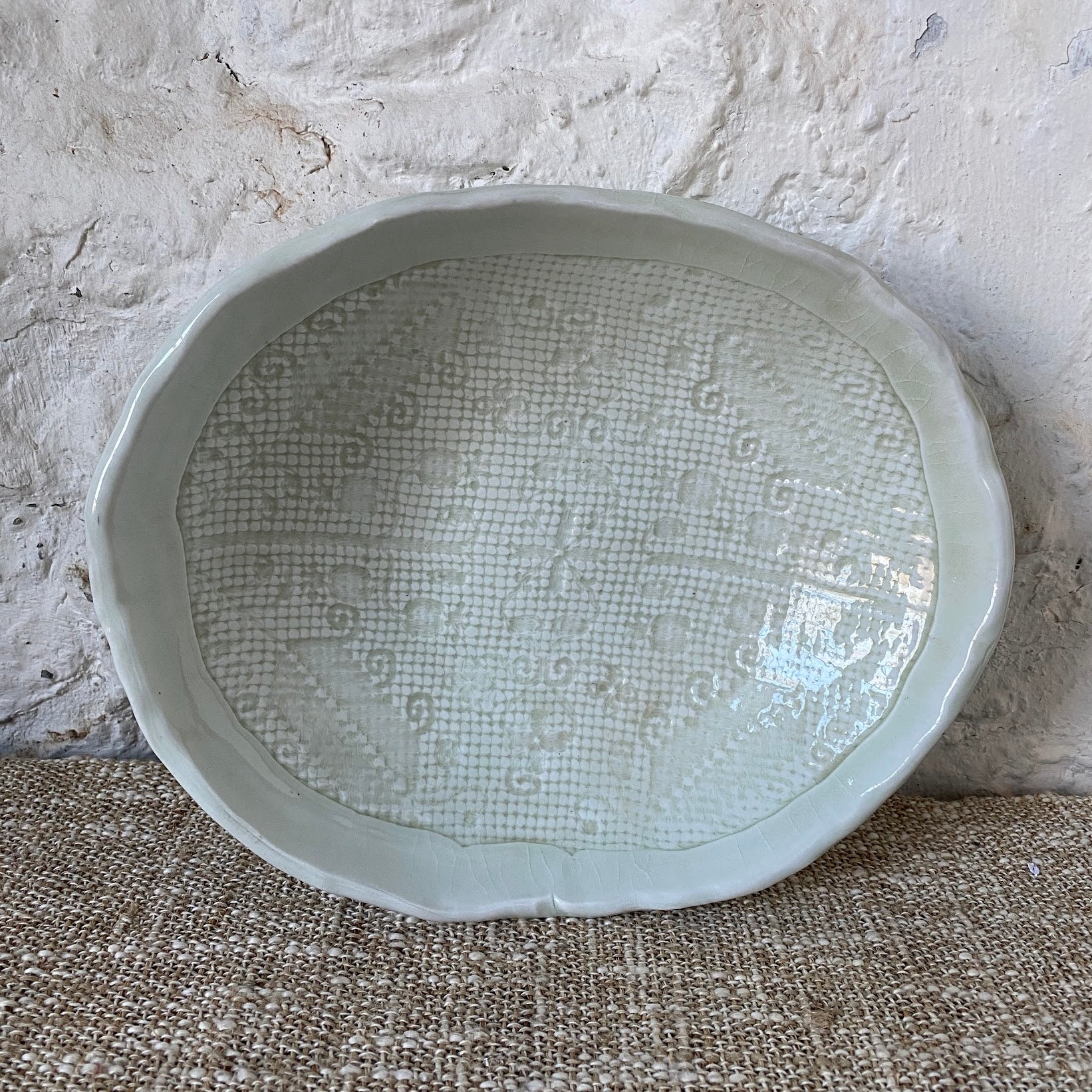 All textured pieces are handmade using various methods. We use a combination of texturally intriguing items like vintage lace, antique rolling pins, stamps, and wooden blocks, just to name a few. Some textures are even made with old tools that were used many years ago when our studio was still an operating brewery.