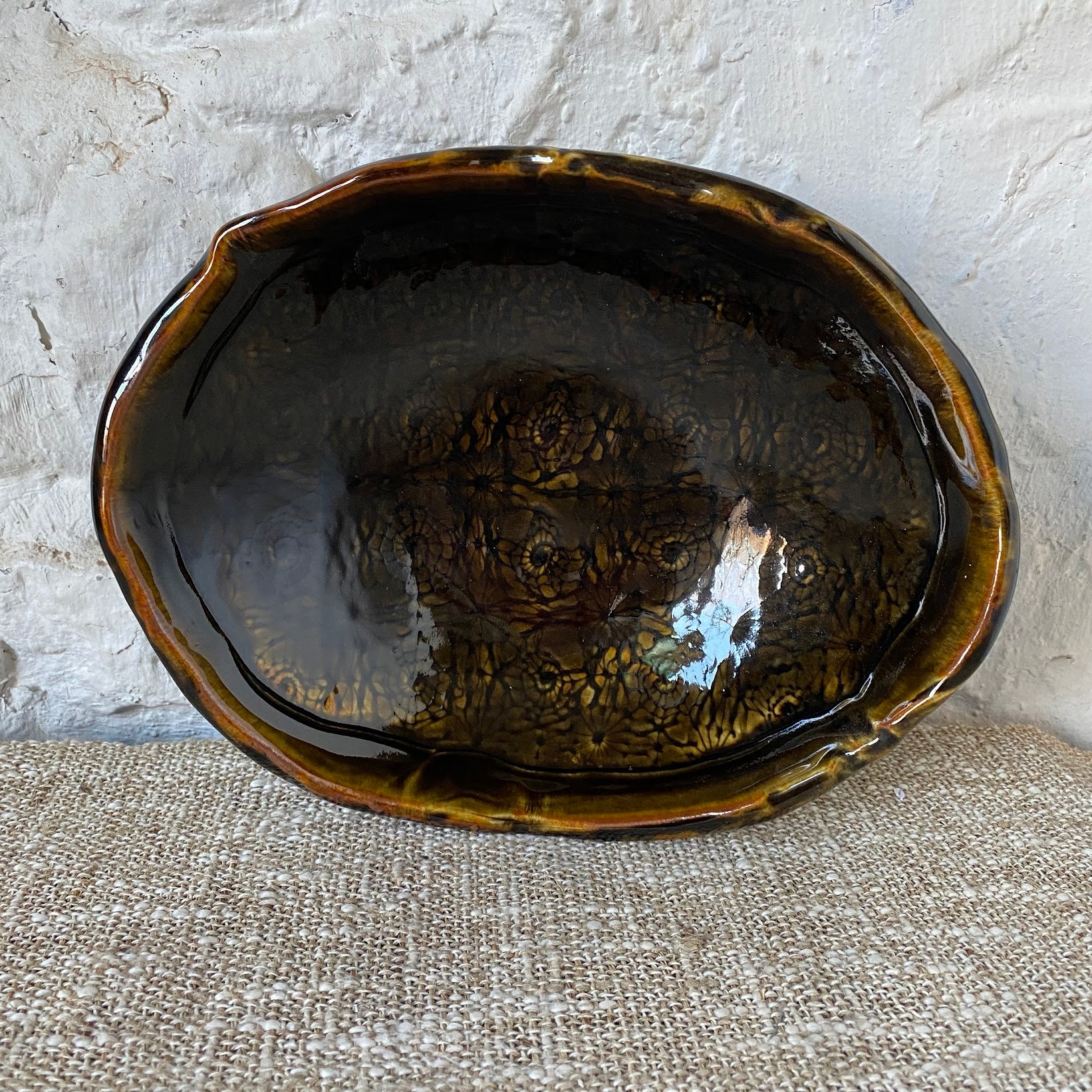 Although the sky is always the limit for what you can use pottery for – the size and shape of this dish would be ideal for serving such things as a side dish at dinner, a dip like hummus or tabouli with cut pita, or even cut up watermelon at a summer party!